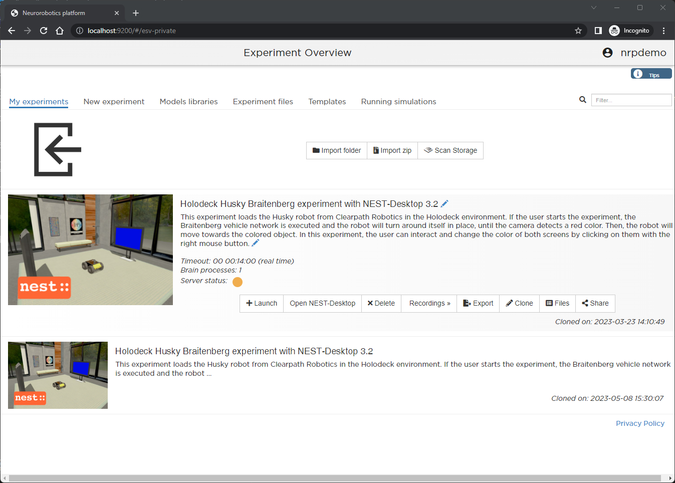 Follow these steps for a smooth experiment using NRP with NEST Desktop: