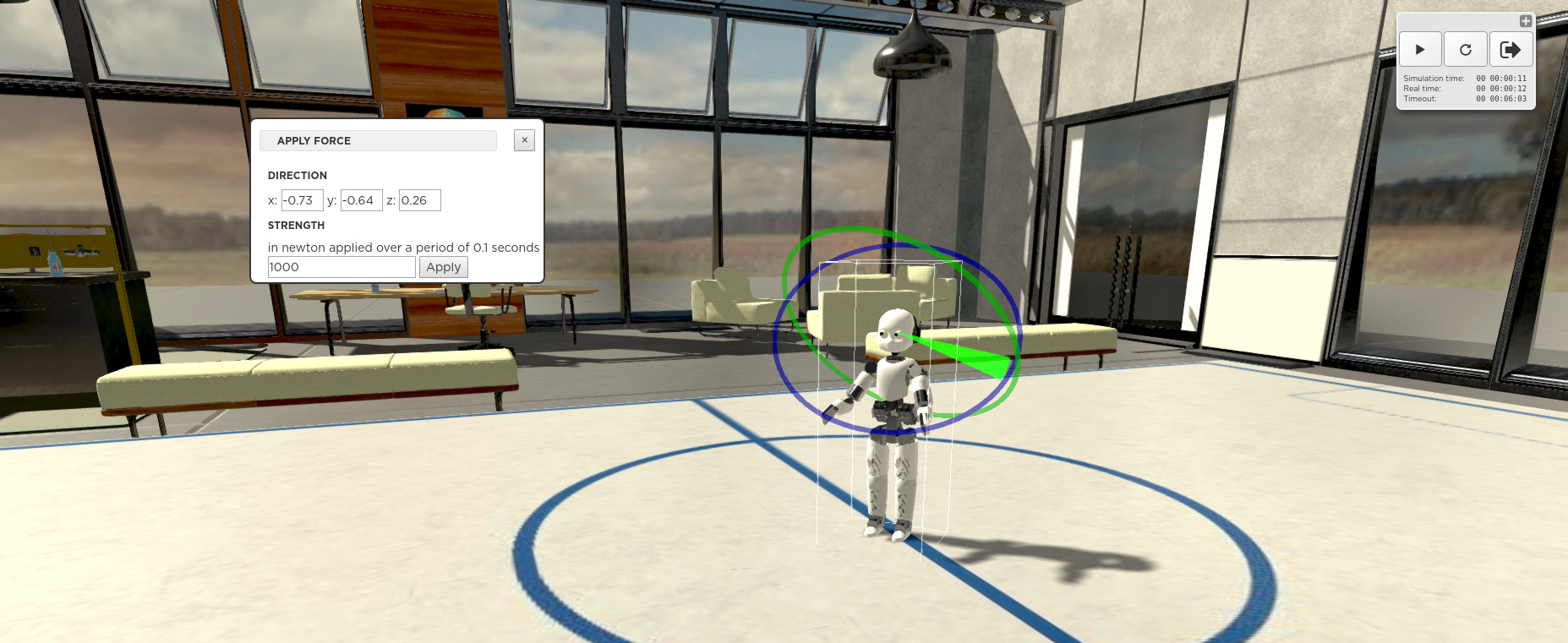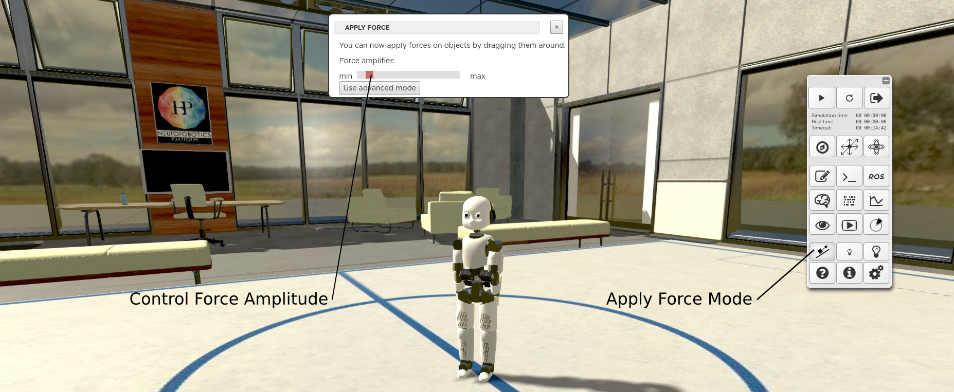 You can perturbate a robot by applying a force on its body or on the objects it is interating with. To do so, press the Apply Force button of the toolbar.